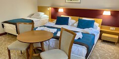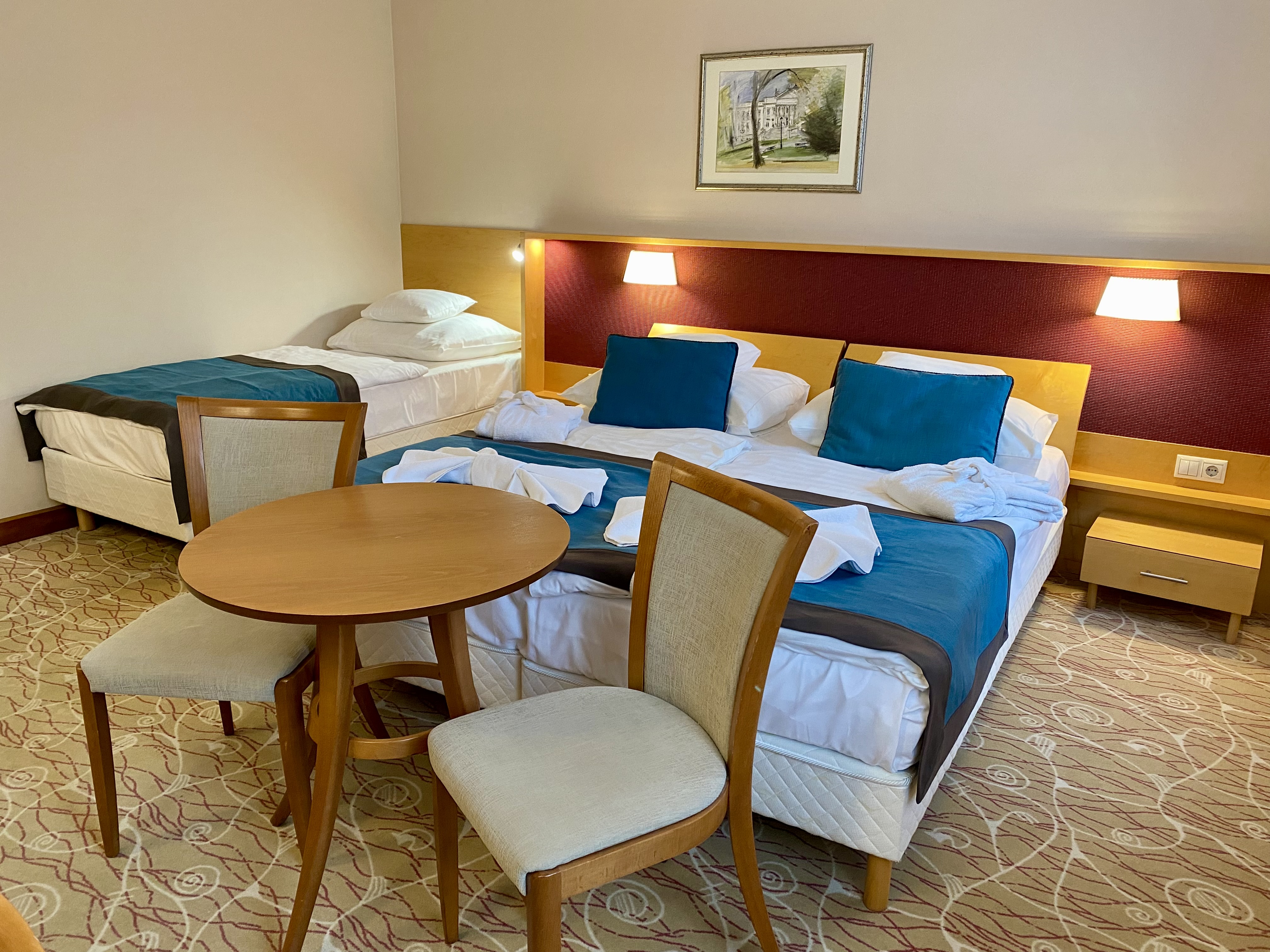 The spacious bathrooms feature a comfortable bathtub, along with a hairdryer and bathrobe, ensuring every moment of your day is restful. The three 90 × 200 cm beds placed side by side provide perfect comfort, while a kettle is also available for preparing a pleasant hot drink, ensuring a truly comfortable stay.